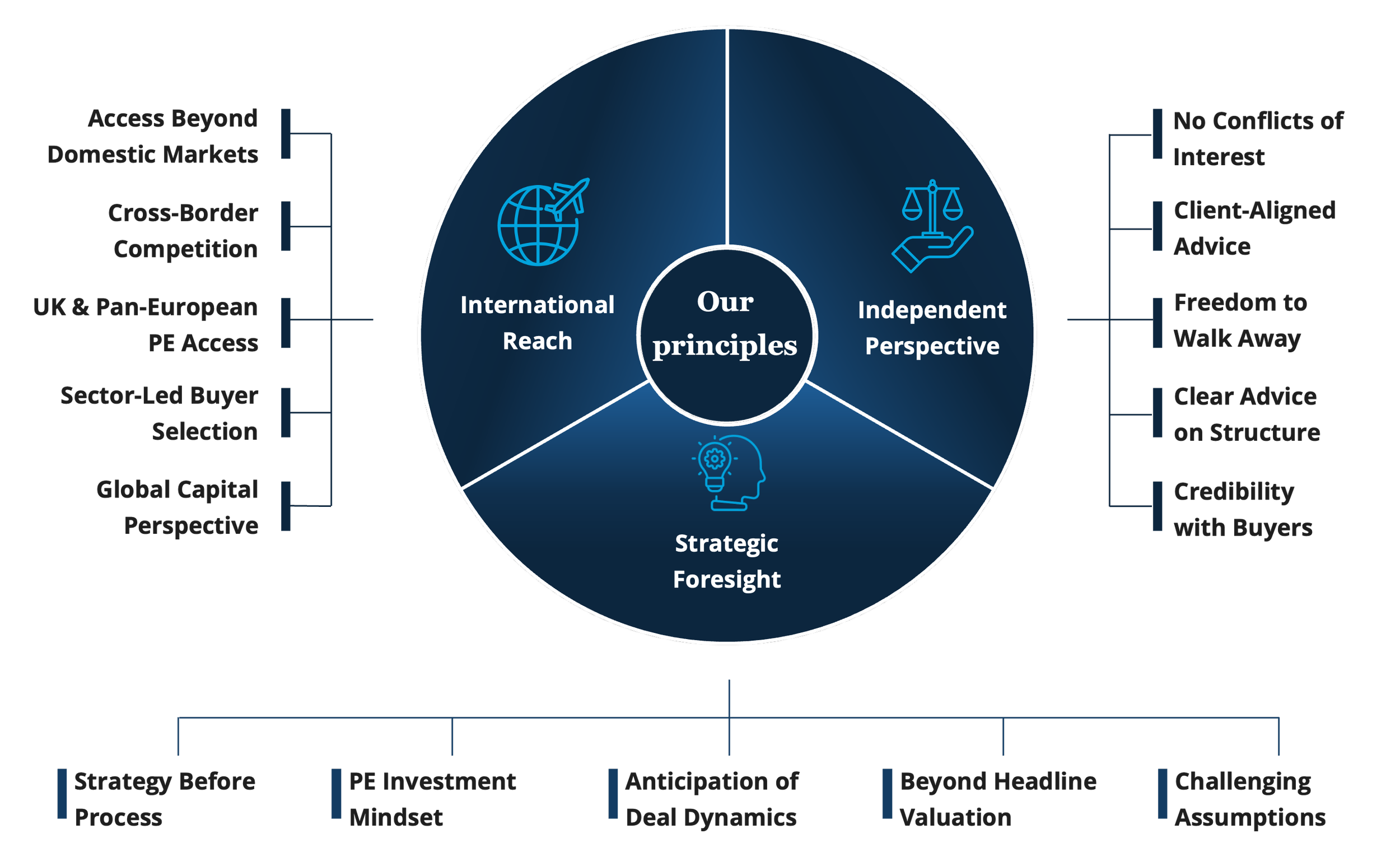 Our work starts with a comprehensive analysis with the aim to develop a strategy that maximises outcome for our clients, focusing on price, deal structure, governance, Rollover equity, downside protection and future exit optimality.