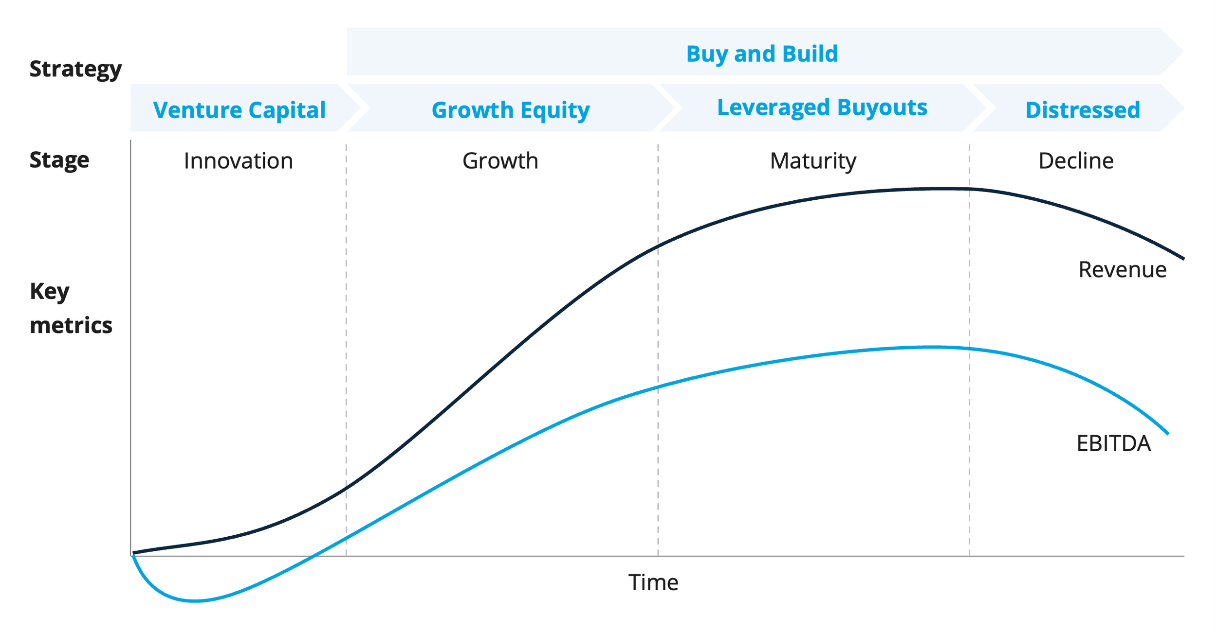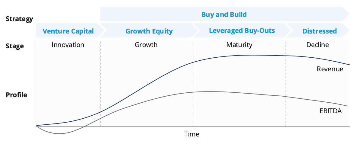 Across Europe, LBOs and Buy-and-Build strategies sit firmly in the maturity phase of the business lifecycle: established revenues, positive EBITDA, defensible market positions and predictable cash flows.